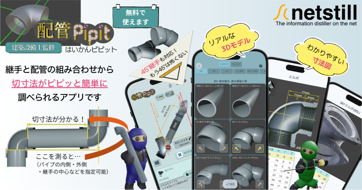 配管Pipit(はいかんピピット)は、継手の組み合わせから切寸法をピピッと簡単に求められるアプリです。無料で使えます!